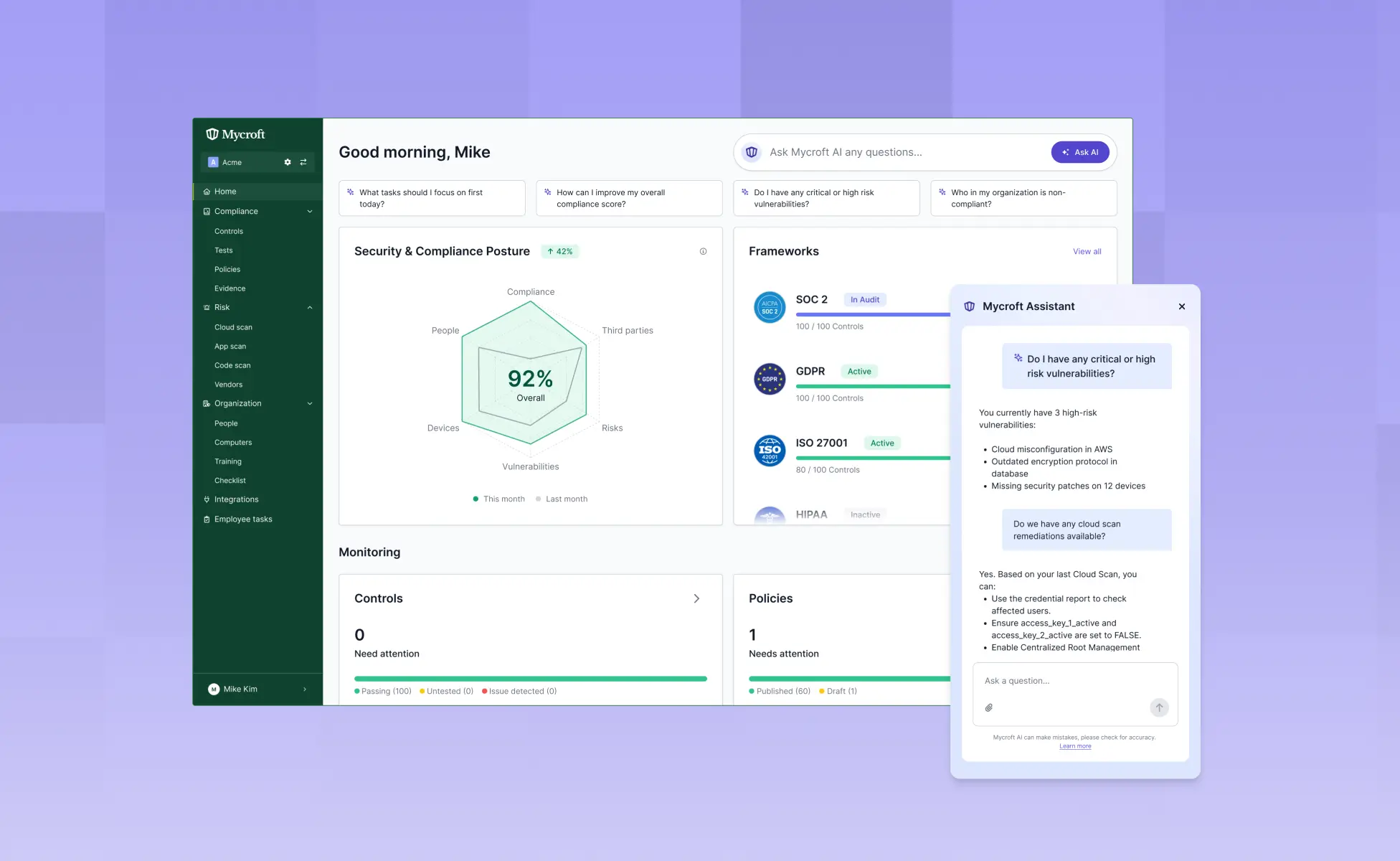 Mycroft enables organizations to replace sprawling, complex security systems with a single platform. Purpose-built for enterprise-grade security and without the usual bloat. Mycroft automates security, maintenance, and compliance functions from start to finish, all in one interface. Our AI Security and Compliance Officer continuously: